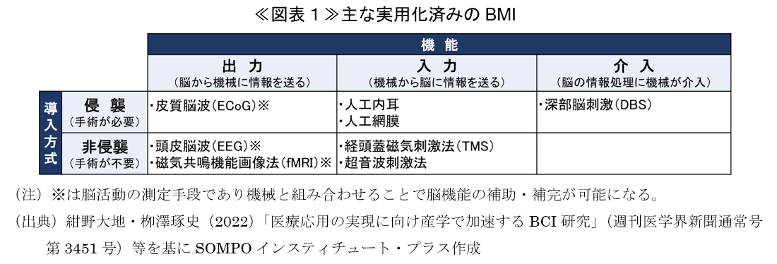 BMIは機能や体内への導入方式によって次のように分類することができる。機能としては、機械から脳に情報を書き込む「入力型」、機械が脳の情報処理に介入する「介入型」、脳から機械に情報を書き出す「出力型」がある。導入方式としては、手術によって脳の表面や脳内にセンサーを設置する「侵襲型」と、体外のセンサーで脳活動データにアクセスする「非侵襲型」に分けられる。侵襲型は取得できるデータの質が高い利点がある一方、デバイスを留置することによる組織の損傷や免疫反応、感染症リスク等の課題がある。