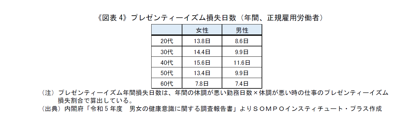 実際、こうした健康課題は、女性の働き方やキャリア形成にも影響がある。正規雇用者の年間の仕事のプレゼンティーイズム12損失日数は、特に20~50代において、男性より女性の損失日数が多い《図表4》。
