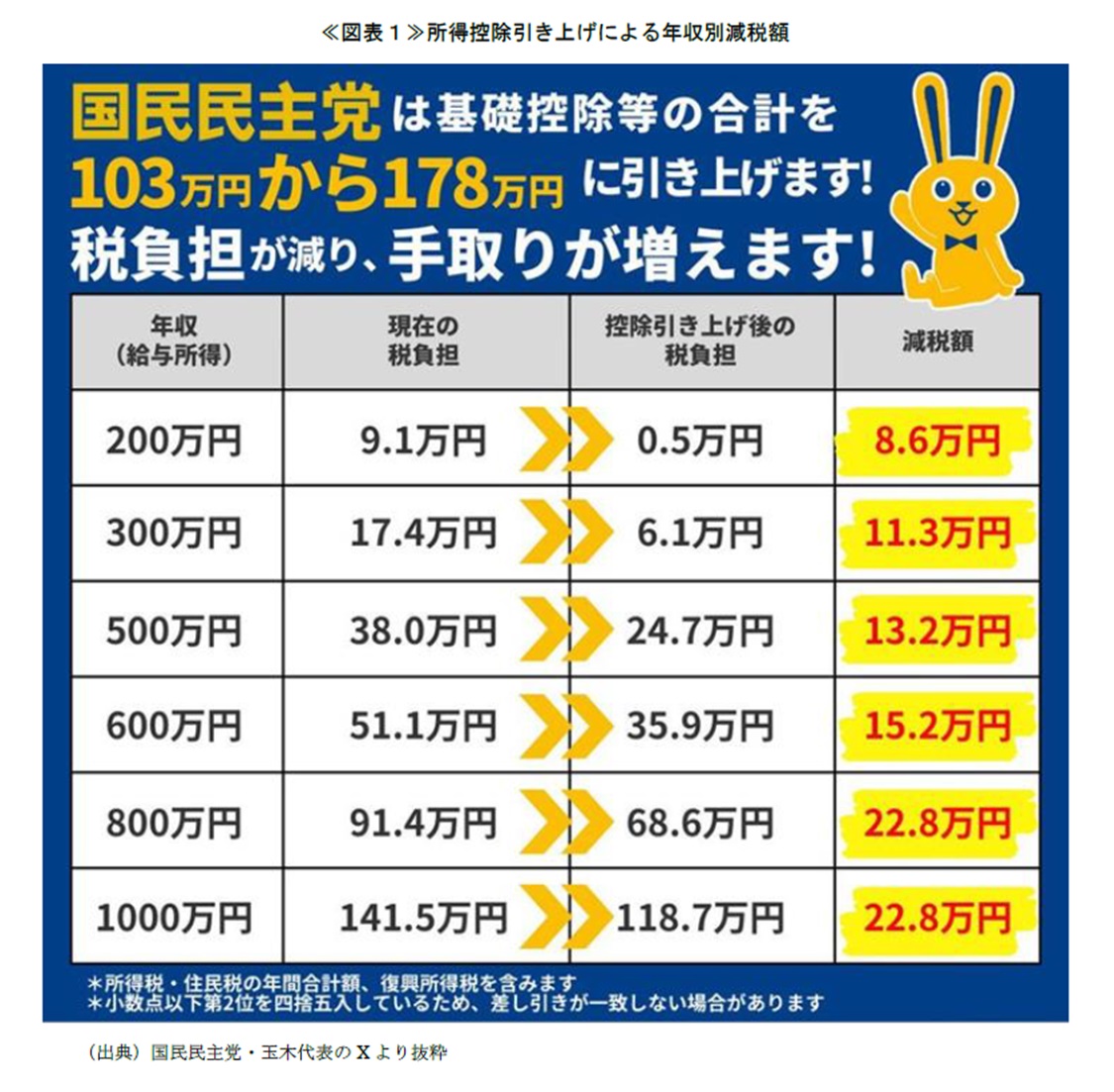 改めて、先の衆院選で国民民主党が掲げた公約を確認したい。公約のうち、「所得税減税」とする項目において、「所得税を課す最低金額の引き上げ等を行い、賃金上昇に伴う名目所得の増加によってより高い所得税率が適用され、賃金上昇率以上に所得税の負担が増えるブラケット・クリープに対応します。具体的には1995年からの最低賃金の上昇率1.73倍に基づき、基礎控除等の合計を103万円から178万円に引き上げます。」とあり、「減税、社会保険料の軽減、ガソリン代・電気代値下げなど生活費の引き下げにより、消費を喚起します。」と説明している。要約すれば、「所得減税による消費喚起(経済成長)を目的として、所得控除の引き上げという政策手段を使う」ということだ。年収ごとの減税額については、≪図表1≫のとおりであり、国と地方を合わせた減税額の合計は、各種の報道によると約7.6兆円とされている。また、衆院選後に玉木代表はXの中で、所得控除引き上げへの否定的な意見に反論する形で「インフレで生きるコストが上がっているのに基礎控除を引き上げなくていいのでしょうか。29年前に決まった水準である103万円がそのままでは生活はますます苦しくなります。それに、103万円をそのままにして、いくら最低賃金を引き上げても、シフトを減らしたり働く時間を削るだけになります。学生アルバイトやパートの皆さん、あるいは人手不足に困っている店長さんたちの声は届いていないのでしょうか。」と綴っている。つまり、「所得減税による消費喚起(経済成長)」に加え、「税制のインフレ対応」「働き控えへの対応」も政策目的であると解される。
