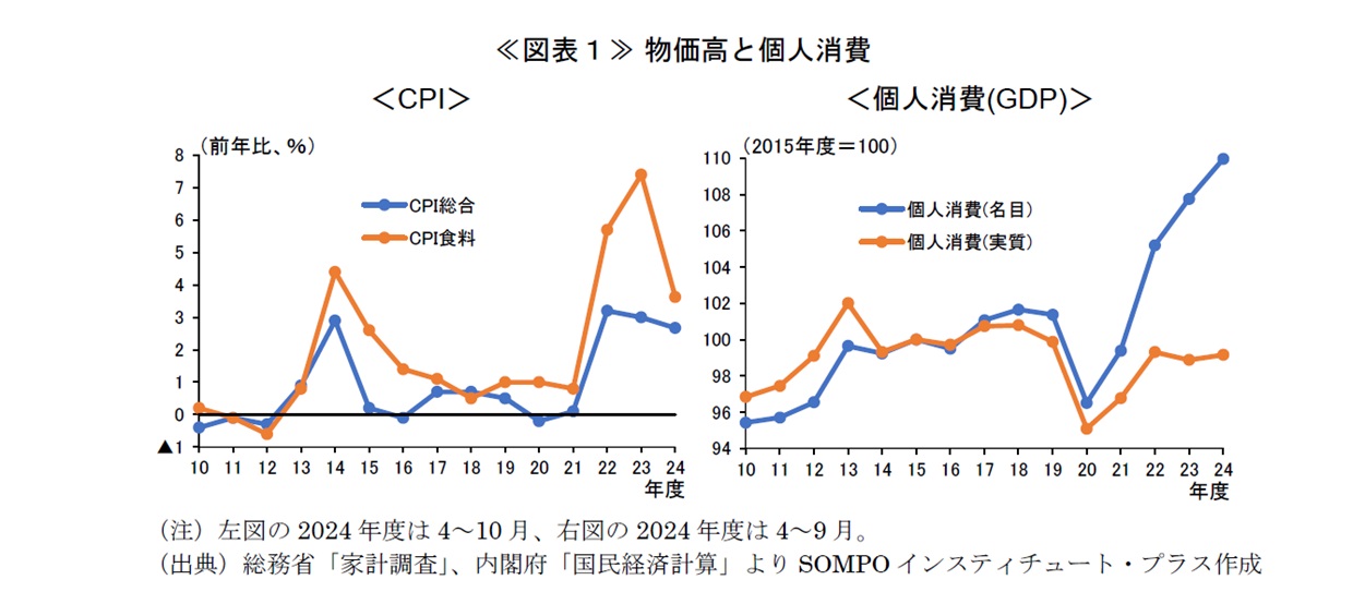 グローバルインフレの影響を受けて、2022年度以降、日本でも高インフレ局面が続いている。とりわけ、家計の物価観にも大きな影響を与える食料品価格の前年比は、23年度の7%台をピークに低下しているものの、足もとなお、消費者物価全体を上回る3%台半ばの上昇率となっている。そうした下で個人消費は、インフレによる名目支出額の増加分を除いた実質ベースでみると、22年度こそ新型コロナ後のペントアップ需要から増加したものの、23、24年度はほぼ横ばいにとどまっており、長引く物価高の影響を大きく受けた状況が続いている≪図表1≫。