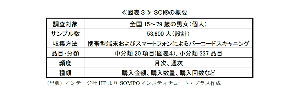 インテージ社では、購買データや生活意識データを中心に、大規模なパネルデータを有している。これらのうち代表的なものとしては、小売店の販売情報を集約した「SRI+®(全国小売店パネル調査)」と、消費者の購買情報を集約した「SCI®(全国消費者パネルデータ)」が挙げられる。このうち、SCI®の概要は以下の通りとなっている≪図表3≫。