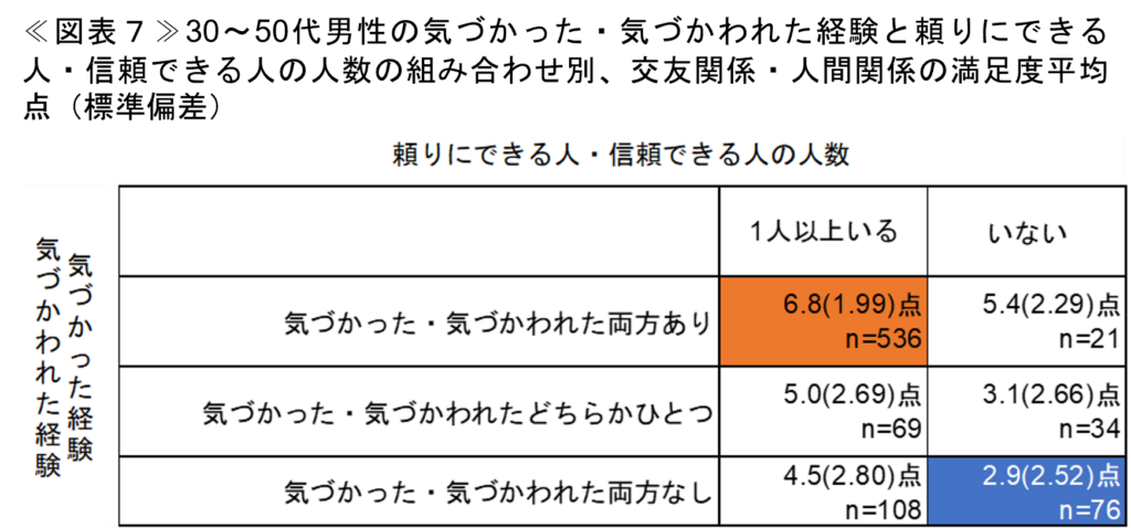30~50代男性は、気づかった経験と気づかわれた経験ともにあると回答する者は、人間関係の満足度が高くなる傾向にあった。さらに、気づかった・気づかわれた経験がどちらか一方の場合や、どちらの経験も全くない場合は満足度が低いと回答する傾向があった。頼りにできる人・信頼できる人も1人以上いる場合は、いない者に比べて満足度が高いと回答する傾向にあった。信頼できる人の有無に関わらず気づかいの受け渡しが上手くいくと平均点は高くなった。まず、自ら他者を気づかうことから始めてみることが、人間関係の満足度を高める初めの第1歩となるだろう。例えば、連絡をとっていない家族や古くからの友人に連絡をとってみる。近所の人に挨拶をする、職場の人に感謝の気持ちを改めて伝えてみる、SNSでフォローしているアカウントの投稿に「いいね!」を押してみる、等である。今の生活を大きく変えることなく、何気ない気づかいから始めてみても良いのかもしれない。無論、気づかいをすれば必ず満足度が上がるケースばかりでもない。気づかった経験があっても気づかわれない場合は、そのような人間関係から距離を置き、新たな人間関係を構築する必要も時にはあるだろう。「人に情けを掛けておくと、いつかは巡り巡って結局は自分のためになる」という意味で「情けは人のためならず」ということわざがある。これに倣うと「ちょっとした気づかいは人のためならず」なのかもしれない。