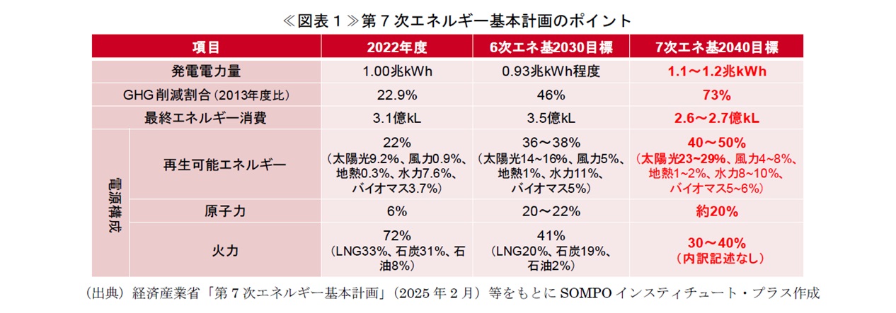 政府は2025年2月、第7次エネルギー基本計画を閣議決定した。温室効果ガス(GHG)排出量を2013年比で73%削減する目標が掲げられたほか、2040年度の発電電力量を1.1~1.2兆kWhと2023年度比で2割増を想定しており、これに再生可能エネルギーと原子力を両立して対応していく方針が示された。