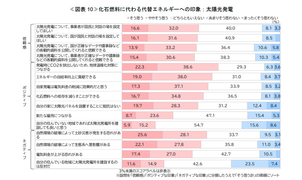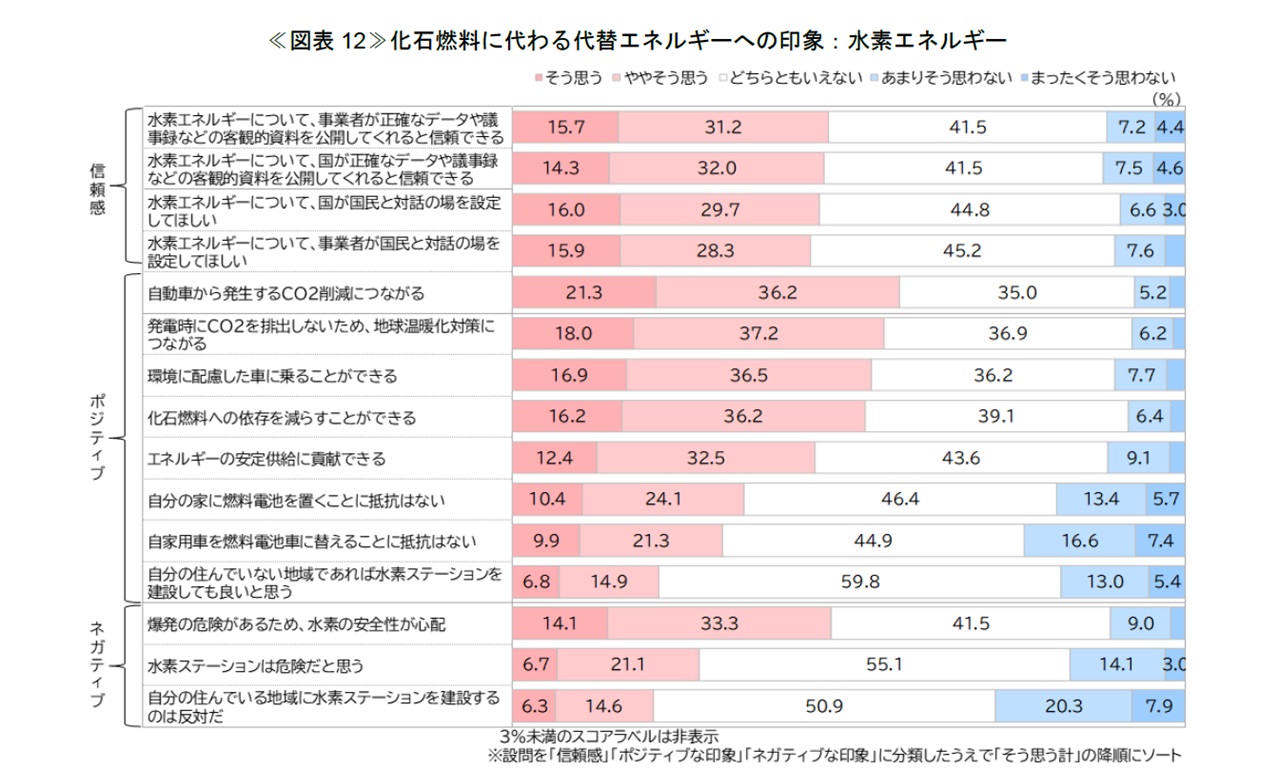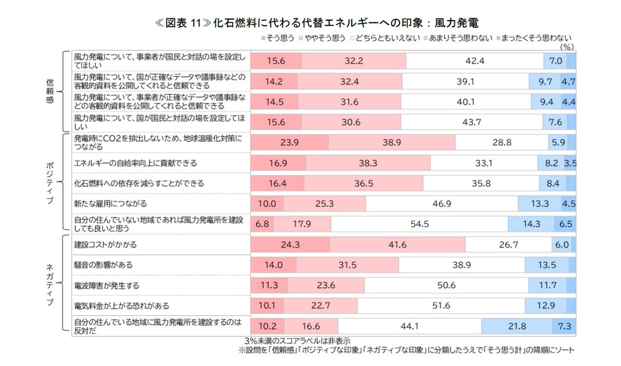 原子力への印象については、「建設・安全確保・廃炉に費用が掛かる」(そう思う+ややそう思う、以下同様:73.6%)、「放射性廃棄物処理の見通しが立っていない」(70.3%)、「安全性が心配」(70.1%)が7割台でネガティブなイメージが上位に挙がるが、「電気料金が安定する」(57.7%)や「エネルギーの安定供給に貢献する」(56.7%)といったポジティブなイメージも後に続く。一方、再生可能エネルギー(太陽光発電・風力発電)や水素エネルギーに関しては、「地球温暖化対策につながる」や「エネルギーの自給率向上に貢献できる」といったポジティブなイメージが上位に挙がっている。ただし、「太陽光の自然環境の破壊によって土砂災害が発生する恐れがある」(53.7%)や風力発電の「建設コストがかかる」(65.9%)といったデメリットも冷静に認識されている(図表9~12)。
