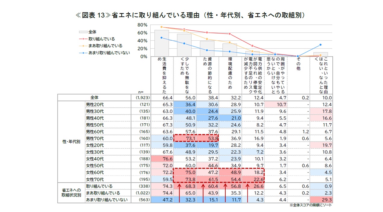 省エネについては、「全体の92.1%が省エネに取り組んでいる。省エネに取り組む理由を尋ねると、全体の傾向として「生活費を抑えるため」が66.4%で最も高く、次いで「少しでも無駄をなくすため」(56.0%)、「資源の節約になるため」(38.4%)、「環境配慮のため」(32.2%)が続く(図表13)。性・年代別で見ると、男女ともに年代が高い層で「無駄をなくすため」「資源の節約」との理由が高く、また、女性では「環境配慮」などの理由も目立つ。省エネへの取組状況別では、取り組みを実施している層ほど「少しでも無駄をなくす」「資源の節約になる」「環境配慮」など、明確な理由を持って省エネに取り組んでいることが見て取れる。
