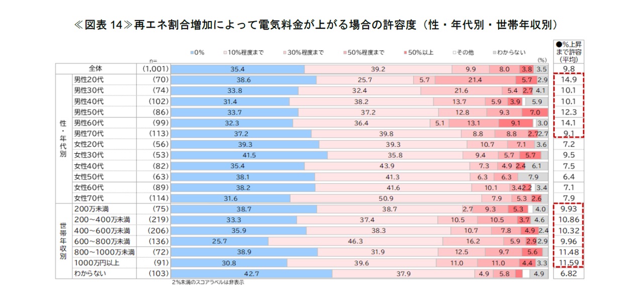 国民のコスト意識について、再生可能エネルギーに賛成すると回答した人(n=1,001、図表6参照)のうち、再生可能エネルギーの導入によって電気料金が上がる場合に許容できる上昇率は平均で9.8%に留まり3、またこのうち35.1%は「0%(何%も許容できない)」と回答しており、家計への直接的な負担増には強い抵抗感があることが窺える(図表14)。男性は女性に比べ許容できる電気料金上昇率が高い傾向にあるが、世帯年収別では許容度の平均について大きな差は見られなかった。