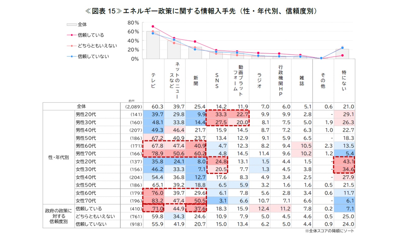 エネルギー政策に関する情報入手先は、全体傾向では「テレビ」が60.3%で最も高く、次いで「ネットのニュースなど」(39.7%)、「新聞」(25.4%)が続く(図表15)。性・年代別で見ると、男女60~70代は「テレビ」「ネットのニュースなど」「新聞」での情報接触率が高い一方、男女20~30代は「SNS」が高く、男性20~30代は「動画プラットフォーム」も高い。信頼度別で見ると、政府を信頼している層は全体と比較して特に「テレビ」「新聞」での情報接触率が高い傾向にある。