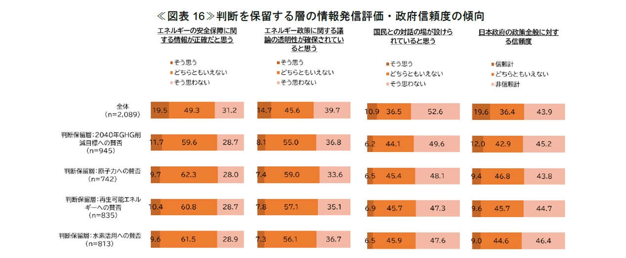国民の社会問題への関心は総じて高く、エネルギーの安定供給に対しても全体の66.9%が関心を示している一方で、国のエネルギー政策に対しては賛否の判断を保留(「わからない」と回答)する層は3~4割以上と多く見られる結果となった。この判断保留層は、政府への信頼やエネルギーに関する情報発信の評価において、相対的に低い、あるいはどちらともいえないという態度をとることが多い傾向にある(図表16)。