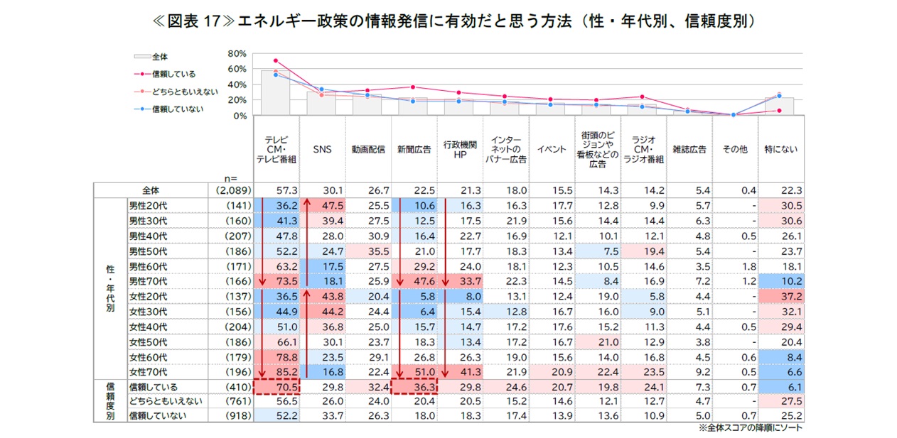 本調査では、国民がエネルギー政策の情報発信に有効だと考える方法についても尋ねており、その結果は、対象に応じたチャネル選択の重要性を明確に示していると言えよう(図表17)。全体傾向では、「テレビCM・テレビ番組」が57.3%で最も高く、次いで「SNS」(30.1%)、「動画配信」(26.7%)、「新聞広告」(22.5%)、「行政機関HP」(21.3%)と続く。性・年代別で見ると、男女ともに年代が高い層ほど「テレビCM・テレビ番組」「新聞広告」「行政機関HP」が高く、反対に年代が若い層ほど「SNS」が高い傾向が窺える。信頼度別では、信頼している層は特に「テレビCM・テレビ番組」「新聞広告」が高い。