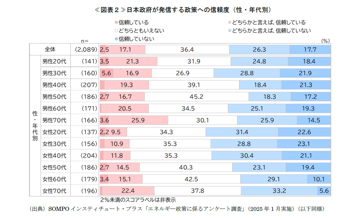 政府の政策全般(エネルギー政策に限らない)に対する信頼度は、「信頼計(「信頼している」+「どちらかと言えば、信頼している」)」が19.6%に留まり、「非信頼計(「どちらかと言えば、信頼していない」+「信頼していない」)」が43.9%と上回っている2(図表2)。性・年代別で見ると、全体と比較して特に女性の若い年代層で信頼度が低い傾向が見られる。