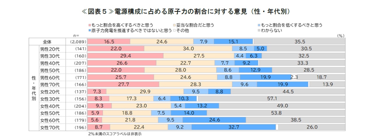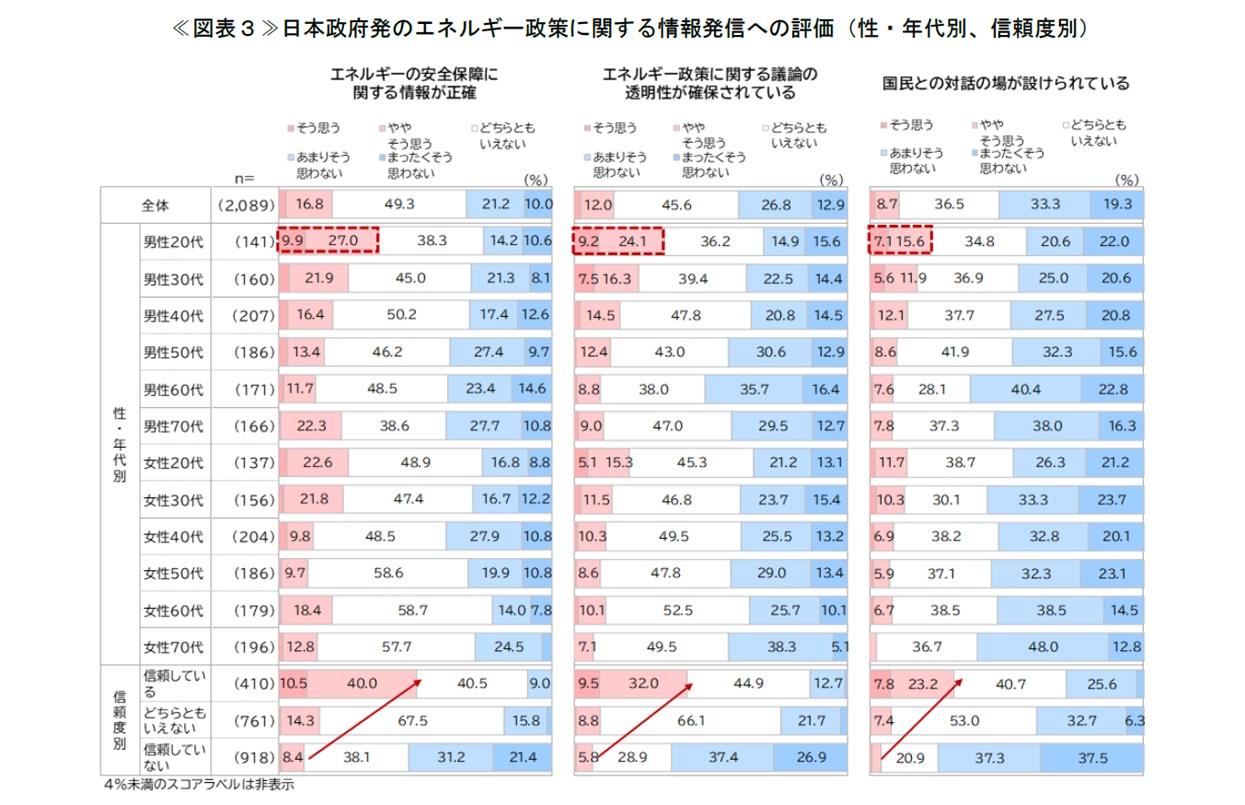 また、エネルギー政策に関する情報発信の評価については、「エネルギーの安全保障に関する情報が正確だと思う」が19.5%、「エネルギー政策に関する議論の透明性が確保されていると思う」が14.7%、「国民との対話の場が設けられていると思う」が10.9%で、情報発信への評価は総じて低い傾向である(図表3)。一方で、20~30代では比較的情報発信への評価は相対的に高い傾向にあり、特に男性20代は各評価が高い。