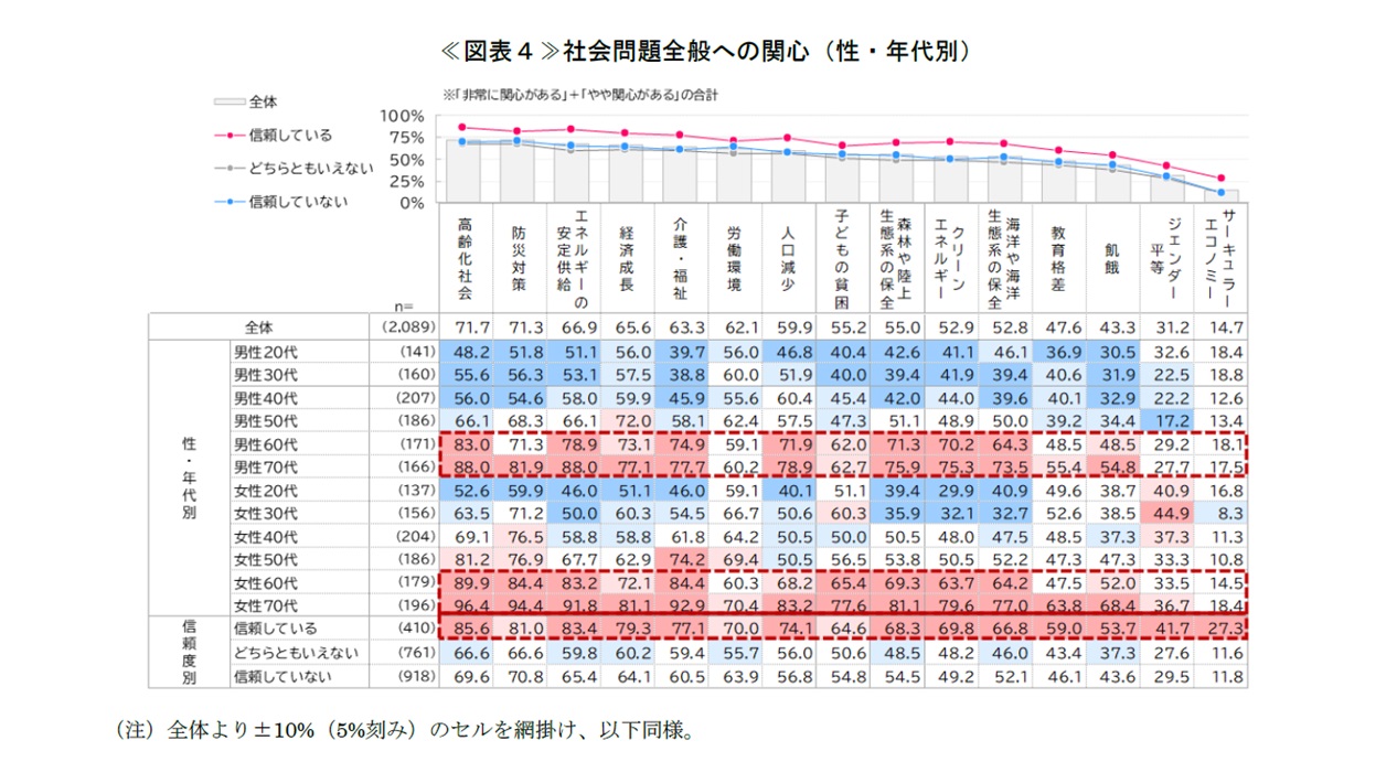 このように、政府への信頼度やエネルギーに関する情報発信の評価は総じて低い一方で、社会問題全般への関心について見ると、「高齢化社会」(71.7%)、「防災対策」(71.3%)に次いで「エネルギーの安定供給」(66.9%)への関心が高く、特に男女ともに年代が高い層でこれらへの関心が高い傾向が窺える(図表4)。また、信頼度別で見ると、政府を信頼している層ほど全体的に社会問題への関心が高い。