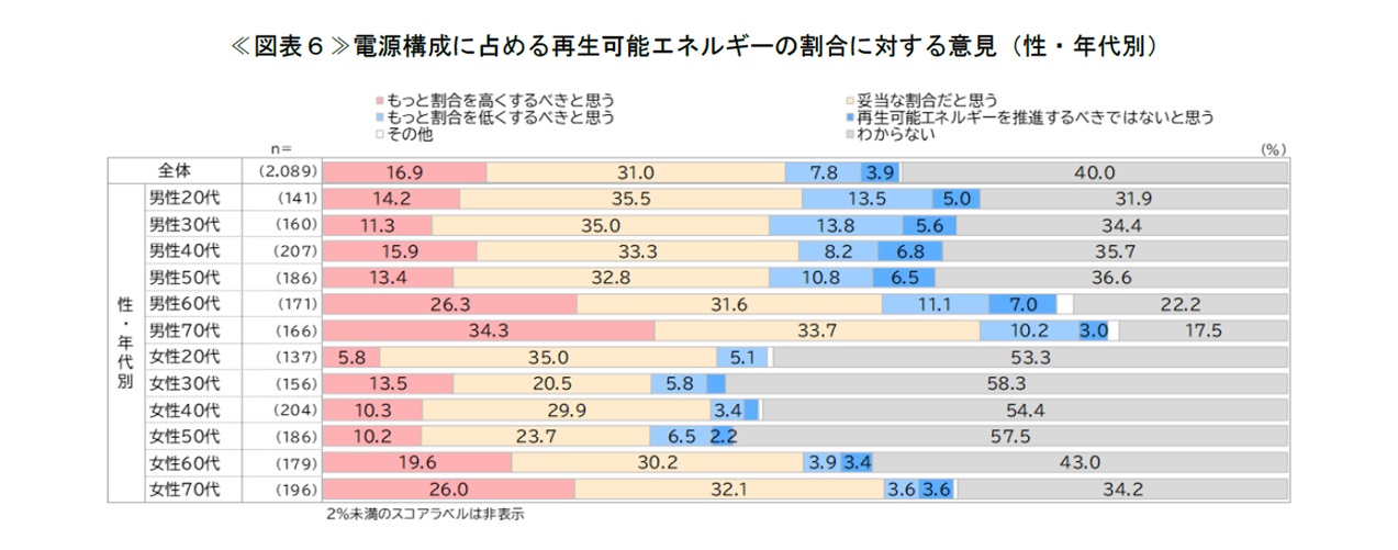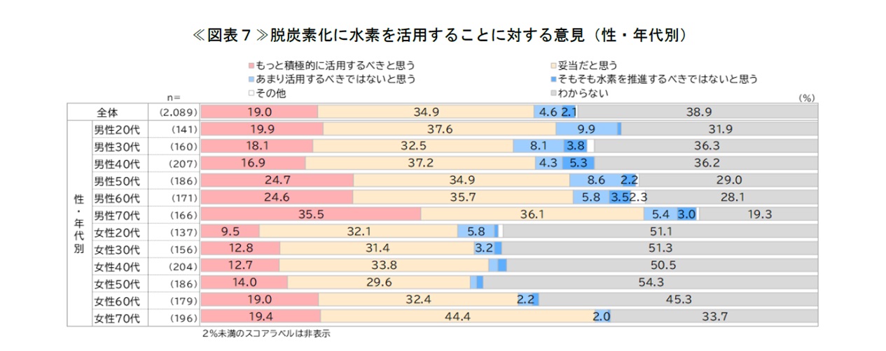 政府不信とエネルギーに関する情報発信の評価の低さが見られる一方、第7次エネルギー基本計画で示された、原子力や再生可能エネルギーの電源構成割合や、脱炭素に向けて水素を活用する方針については、概ね妥当であると考えている人が多い(図表5~7)。ただし、全体の傾向を見ると「わからない」が3~4割と最多で、他選択肢を上回っている。意見を持つ層の中では、原子力や再生可能エネルギーの割合について総じて前向きな意見が多い傾向にあるが、年代が上がるにつれ、原子力については「推進するべきではないと思う」との意見が、再生可能エネルギーや水素については「もっと割合を高くするべきだと思う」との意見が増加する傾向が見られる。