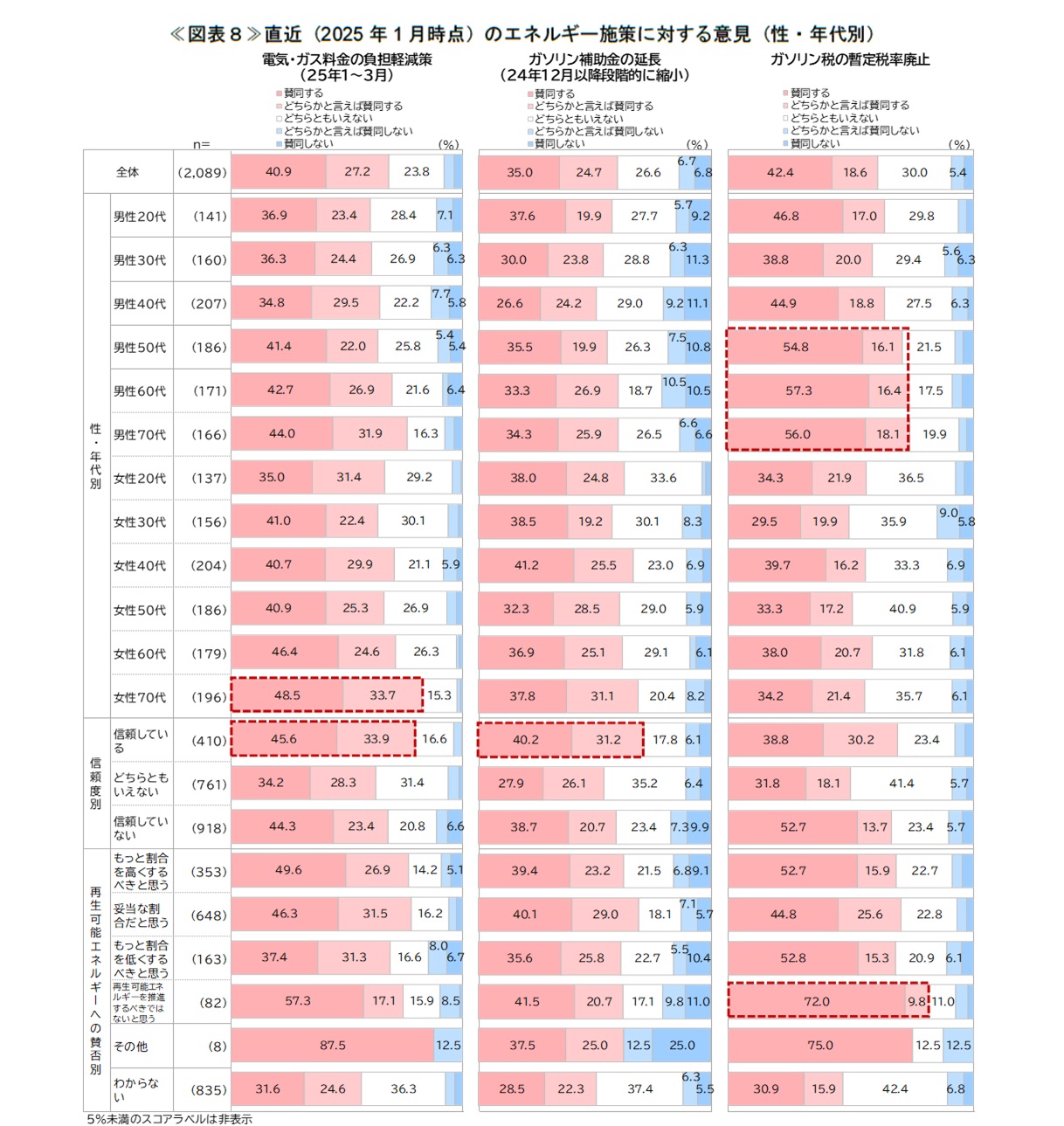 対照的に、国民の家計に直接影響する施策には、明確に賛同意見を表明する傾向が強く、「電気・ガス料金の負担軽減策」(賛同する+どちらかといえば賛同する、以下同様:68.1%)、「ガソリン補助金の延長」(59.8%)、「ガソリン税の暫定税率廃止」(60.9%)と、いずれの施策も6割を超える支持を得ている(図表8)。また、性・年代別では、女性70代で「電気・ガス料金の負担軽減策(25年1~3月)」(82.1%)、男性50~70代で「ガソリン税の暫定税率廃止」(71.0~74.1%)の賛同率がそれぞれ高い。政府への信頼度別で見ると、いずれの施策も政府を信頼しているほど賛同する割合が高いが、「ガソリン税の暫定税率廃止」については、政府を信頼していない層も賛同する割合が66.4%と高い傾向にある。なお、再生可能エネルギーの電源構成割合4~5割への賛否別では、「再生可能エネルギーを推進するべきではないと思う」層は特に「ガソリン税の暫定税率廃止」に賛同する割合が81.7%と高い。