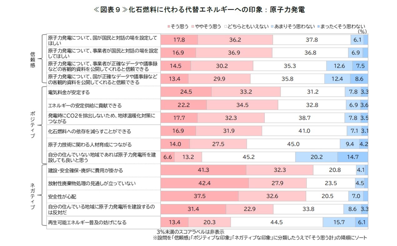 政府はエネルギー白書20254の中で、「国民一人一人が『じぶんごと』として当事者意識を持つことが何より重要であり、政府による情報開示を通じた国民各層の理解促進や双方向のコミュニケーションを充実していくことが重要」であるとしている。この「じぶんごと」に関してみれば、経済的な影響など生活に直結する事柄については、賛否をより明確に表明している(=「じぶんごと」として捉えている)が、第7次エネルギー基本計画の電源構成目標といった中長期的なことや地球規模の事柄に対し、国民は関心を無くす傾向にある。この点からも、エネルギーに関わる事柄は自らの生活に直結するという意味で、より「じぶんごと化」していくことが望ましいと言えるだろう。