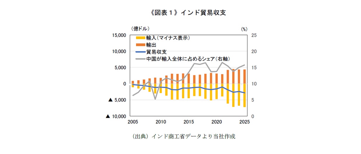 第二に、輸入における中国への依存度の高さだ。かねてより貿易赤字が続いているインドであるが、近年、その赤字額が拡大傾向にあった【図表1】。とりわけ国境紛争により緊張関係にある中国からの輸入が全体の1割以上を占めており、経済安全保障の観点からも問題になっている。製造業基盤が脆弱なため、中間財や部品を中国に依存せざるを得ない現状の打開が必要になっている。