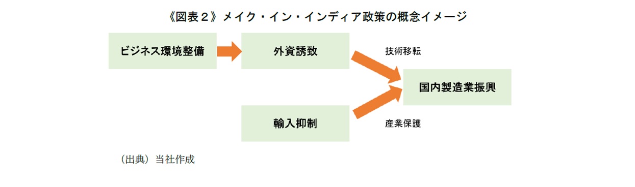メイク・イン・インディア政策とは、製造業を中心とする国内産業の振興を目指すモディ政権の肝いり政策である。アプローチとしては、ビジネス環境の整備を通じて外資誘致を促すことに加え、貿易赤字の縮小と国内での生産拡大の実現に向け、輸入抑制にも取り組むものである【図表2】。