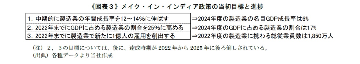 このように数々の施策を講じてきたメイク・イン・インディア政策であるが成果は芳しくなく、進捗は当初目標をいずれも下回っている【図表3】。とりわけ、雇用創出に関する部分は下振れが大きく、国内の雇用不足に対する国民の不満は高まっている。
