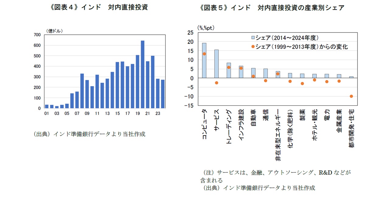 目標を下回った直接的な背景としては、コンピュータ以外の製造業に対する海外からの投資がさほど伸びなかったことがある。まず、インドの対内直接投資の推移をみると、2010年代後半は拡大傾向が続いていた一方、2020年代に入って減少しており、コロナ禍が落ち着いた2023年度以降も回復していない【図表4】。また、対内直接投資の産業別シェアを確認すると、モディ政権が発足した2014年度以降では、コンピュータ、サービスが頭一つ抜けて高く、トレーディング、インフラ建設、自動車と続く【図表5】。モディ政権発足前からのシェア変化を見ると、コンピュータが最も高く、トレーディング、インフラ建設と続く。まとめると、モディ政権発足以降の対内直接投資においては、コンピュータは大きく伸び、高いシェアを占めるに至ったものの、それ以外の製造業についてはさほど伸びなかったことがわかる。