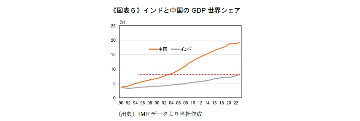 本稿では、議論の出発点として、直近時点のインド経済と、2003年当時の中国経済を比較することにする。これは、世界経済に対する影響力の大きさという意味で、両国のGDPの世界シェアがいずれも8%に到達した時点を選んだことによる【図表6】。