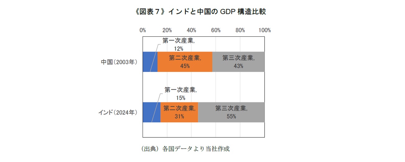 まず、両国の産業構造を比較すると、第一次産業のシェアはほとんど変わらない一方、製造業を含む第二次産業のシェアは中国の方が高くなっており、2003年当時の中国の方が製造業中心の経済であったことがわかる【図表7】。このことは、インドの製造業振興策が成功して来なかった証であるが、同時に、中国では本格的な高成長局面に入る前から製造業の活動について一定の蓄積があり、両国の初期条件が異なっていたことも示している。