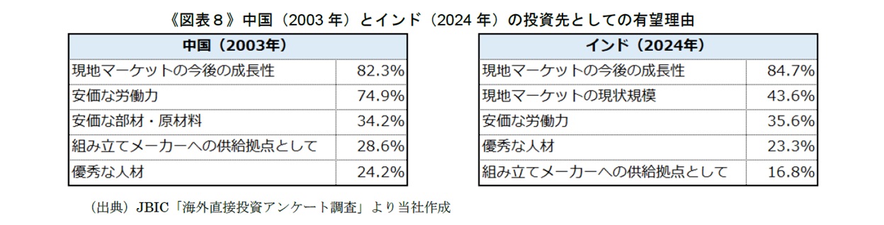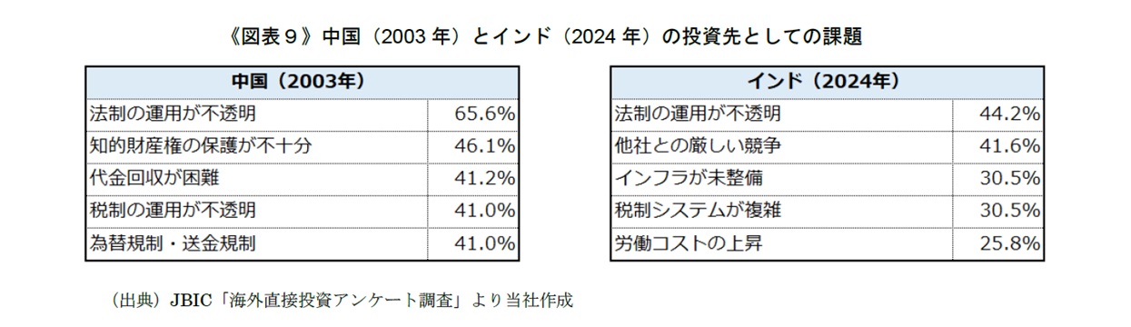 次に、両国の発展形態の違いに関する手掛かりを得るために、JBICの「海外直接投資アンケート調査」で、2003年の中国と2024年のインドそれぞれに対する(事業展開上の)有望理由と課題の上位5項目を比較する。