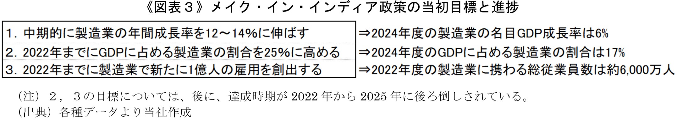 これらの構造的な問題に対処すべく、2014年に発足したモディ政権は、製造業を中心とする産業発展を目指す「メイク・イン・インディア政策」を国家戦略の柱として掲げ、精力的に取り組んできた。同政策は、2025年までに製造業のGDP比率を14年当時の17%から25%に引き上げ、1億人の新規雇用を創出するという野心的な目標を設定していた。