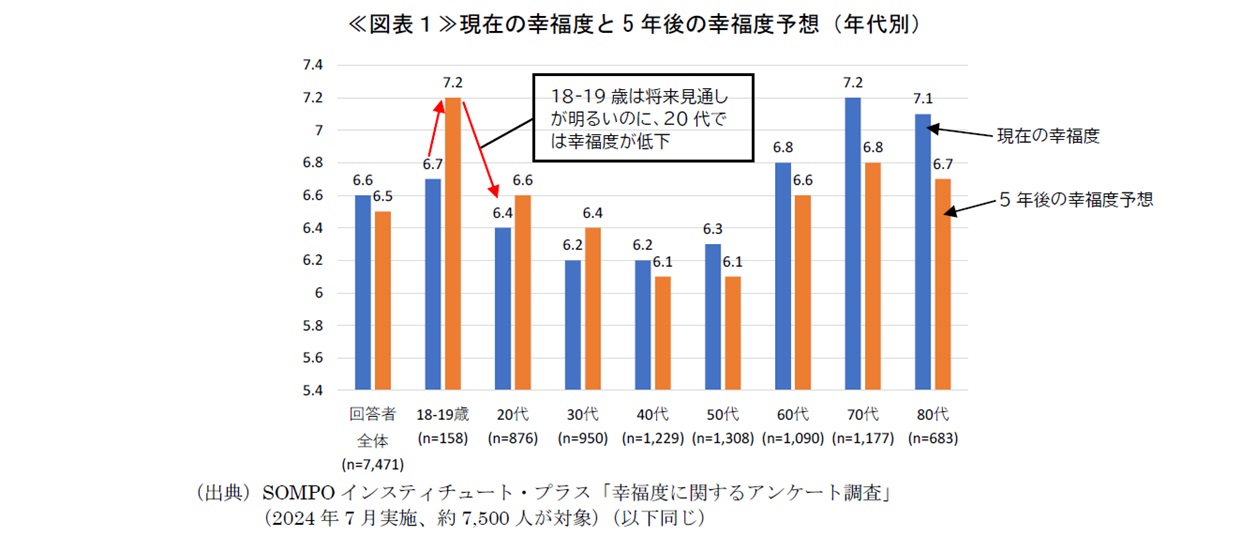 1.若年世代では、学生に比べて就業者の幸福度が低い