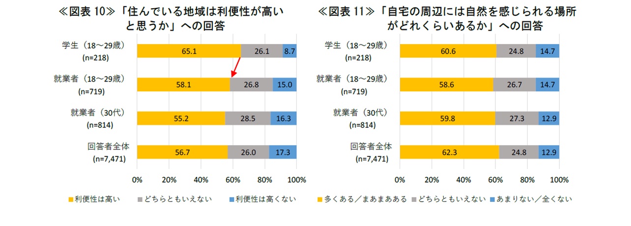 最後に、「住環境・自然環境」については、「住んでいる地域は利便性が高いか」「自宅周辺に自然を感じられる場所があるか」と尋ねている。前者に関しては、「利便性は高い」という回答の割合は、就業者が学生よりも低い(図表10)。一方、後者に関しては、「(自然を感じられる場所が)多くある/まあまあある」と回答した割合は、就業者と学生の間で大きな差はなかった(図表11)。こうした回答結果だけでは、幸福度との関係性について踏み込んだ解釈は難しいが、例えば就業者では、通勤に時間がかかるために居住地の利便性の低さを意識する人が多く、それが幸福度を低下させる一つの要因となっている可能性などが考えられる。