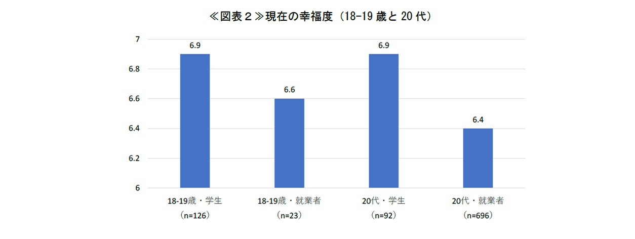 ただ、若年世代は学生と社会人(就業者)が混在しているため、両者を切り分けて幸福度をみると、学生で高く、社会人で低いという特徴が鮮明に確認できる(図表2)。つまり、若年世代については、18-19歳と20代という年代で切り分けて幸福度の差異をみるのではなく、学生と社会人の違いに着目するほうがより適切である。そこで次章では、学生と社会人において、どういった要素が幸福度との間で強い関係性を有しているのかを分析・考察したい。