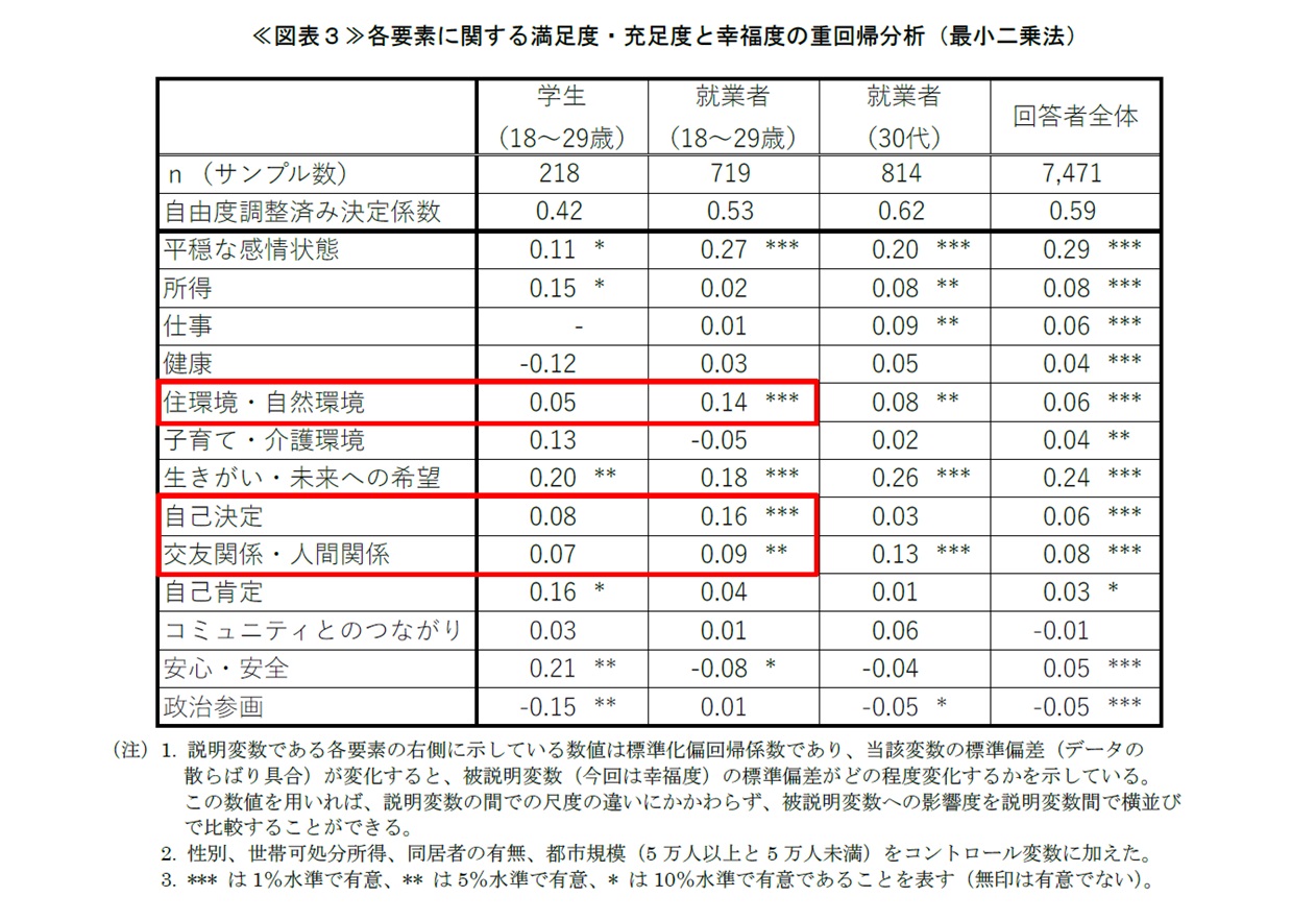 説明変数である各要素の右側に示している数値は標準化偏回帰係数であり、当該説明変数の変化に伴う被説明変数(今回は幸福度)の変化の大きさを示している。アスタリスク(***,**,*)は、幸福度との間で統計的に有意な相関関係があることを示しており、***は最も強い相関関係が確認されたことを表す。逆にアスタリスクが付いていないところは、幸福度と当該要素の間で有意な相関関係が確認できなかったことを意味している。
