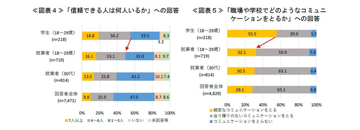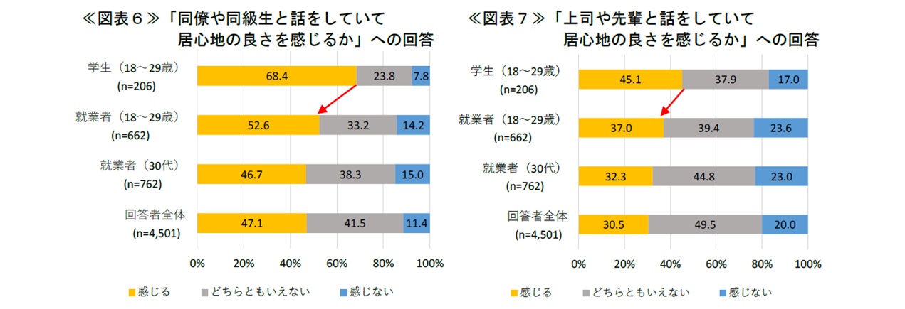 まず「交友関係・人間関係」については、アンケート調査で多くの質問をしており、ここでは3つ取り上げる。1つめは、「信頼できる人は何人いるか」という質問で、4人以上いるという回答割合は就業者が学生よりも低くなっている3(図表4)。2つめは、「職場や学校でどのようなコミュニケーションをとるか」で、親密なコミュニケーションをとるという回答割合は、就業者のほうが学生に比べて、やはり大幅に低いという結果が得られている(図表5)。そして3つめは、「同僚・同級生/上司・先輩と話をして居心地の良さを感じるか」である。これについても「居心地良く感じる」とする回答割合は、就業者が学生よりも低い(図表6,7)。
