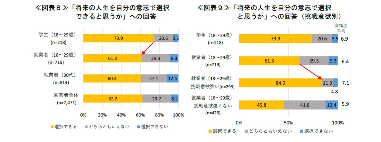 ただ仔細にみると、人生の自己決定について違う側面が浮かんでくる。アンケート調査では、挑戦意欲の強さを確認する質問として、「仕事や学業で、リスクを冒しても新しいことや魅力的なことに挑戦したいと思うか」と尋ねている。これについて「思う」と答えた就業者を「挑戦意欲が強い人」とすると、図表9にあるように、将来の人生を自己決定できると考える割合が84%と大幅に高くなる。そして、挑戦意欲が強い人は、幸福度も若年就業者の平均を大きく上回っている。チャレンジ精神を持てる人は、自らの努力で人生を切り開けるという思いが強く、それが現在の幸福度の高さにもつながっていると考えられる。
