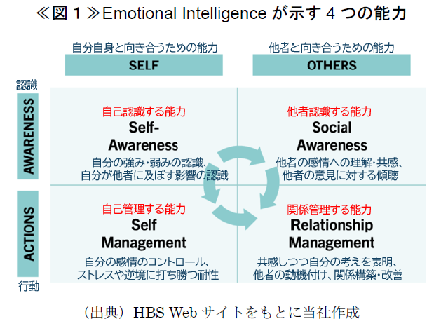 自分自身を客観的にとらえる「自己認識」、自身の感情や行動をコントロールする「自己管理」、相手の感情を理解し共感する「他者認識」、良好なコミュニケーションを通じて信頼関係を築く「関係管理」。これら4つを実現するために必要な能力の総称が、Emotional Intelligence(感情的知性、EI)である ≪図1≫1。