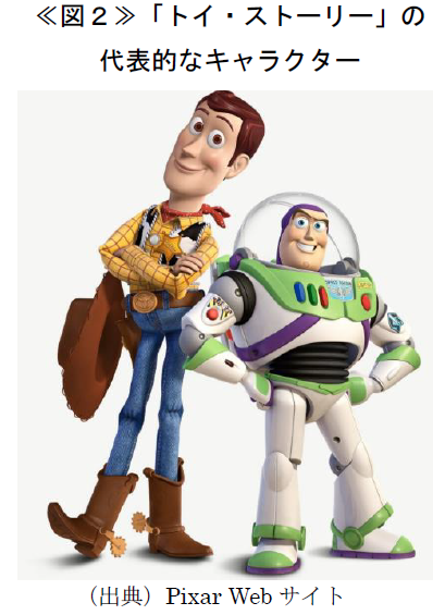 1995年公開作品 「トイ・ストーリー」≪図2≫は、Pixarとして初の長編フルCGアニメーション映画ながら、オリジナル主題歌賞、作曲賞、脚本賞のアカデミー賞3部門でノミネートされるという快挙を達成した20。また、ジョン・ラセター監督は、そのリーダーシップが評価され、受賞者が毎年必ずいるとは限らない希少価値のあるアカデミー特別業績賞を受賞した21。このように華々しく長編映画監督デビューを果たしたことも、同作品が世界から脚光を浴びるきっかけとなった。