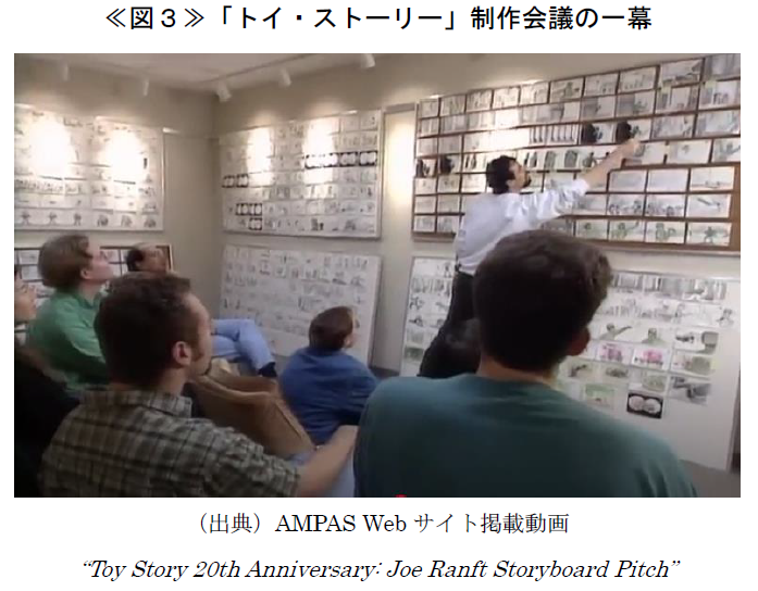 “Peer Culture” は映画界を中心に好評を博している。AMPASは「トイ・ストーリー」の共同脚本家が自ら作成した絵コンテを用いて、音響やカラーデザインなど各部門の責任者を集めた制作会議が「トイ・ストーリー」を傑作に導いた要素のひとつとして取り上げている≪図3≫。 脚本家だからと自身の制作シナリオを「決定事項」として共有するのではなく、「たたき台」として一連のセリフを一人で何役もこなしながら制作会議の場を「劇場」に模して披露している。そして、会議の参加者による新たな視点や率直な意見などと照らしながら、互いに補い合いながら、「素晴らしいものを世に送り出したい」という共通した思いのもと、 全員で最高の作品に仕立て上げていった。