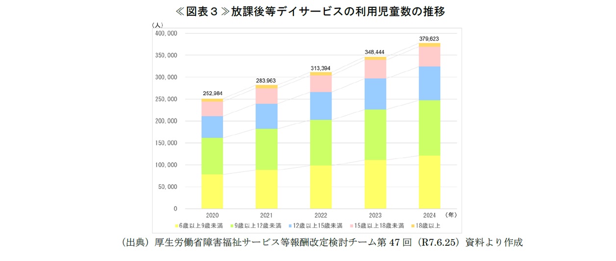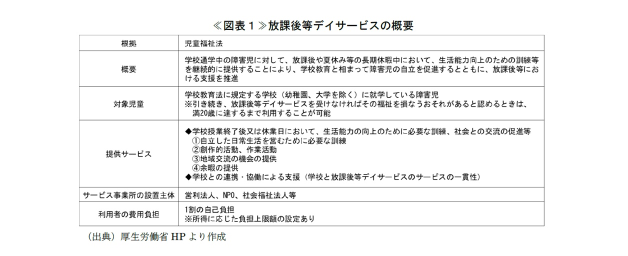 障害者を支援する制度は、原則18歳で児童福祉法から障害者総合支援法に基づく制度へと切り替わる。「放課後等デイサービス」は児童福祉法に基づく制度であり、学齢期における放課後や夏休み等における支援の充実のため、2012年に創設された。原則として学校教育法に規定する学校(幼稚園、大学を除く)に就学している6歳から18歳までの障害児を対象としている≪図表1≫。