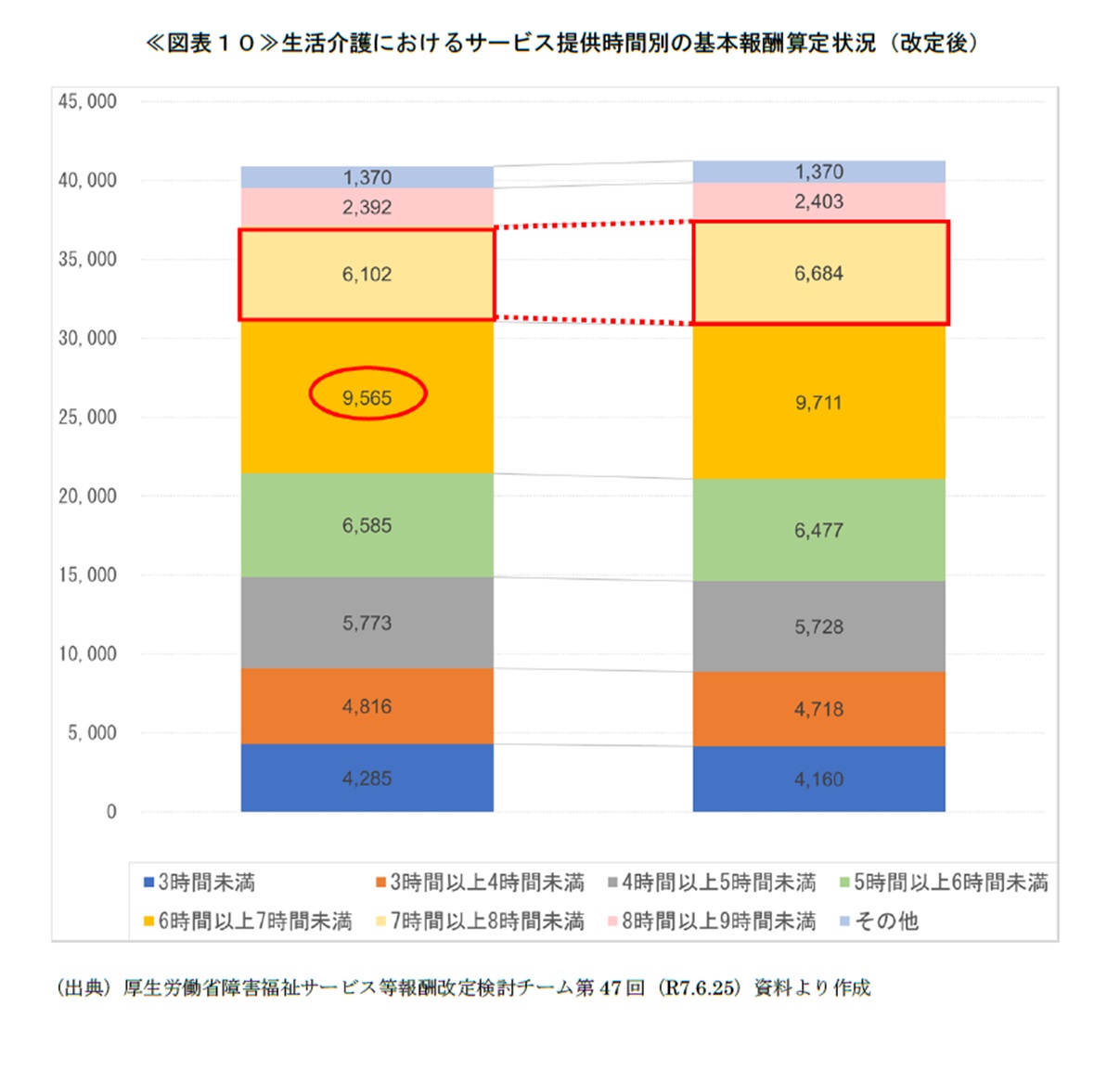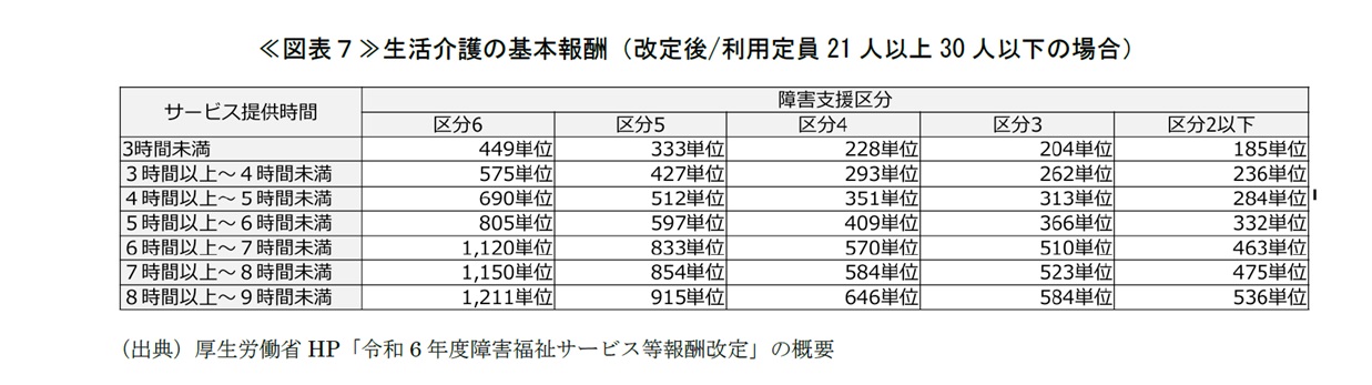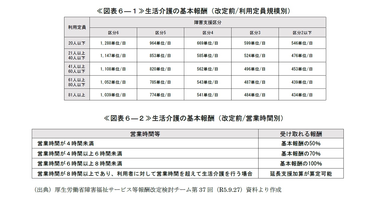 2023年5月の財政制度等審議会財政制度分科会において、障害福祉サービス量が急増していることを背景に、サービスの報酬について「営業時間で設定され、利用者ごとのサービス利用時間が考慮されてない。利用時間の実態に基づいた報酬体系に見直す必要。」との指摘があったことを受け、改定の検討が行われた。改定前の生活介護における基本報酬は、障害支援区分ごと及び20人ごとの利用定員規模別、営業時間別で設定されていた≪図表6≫。