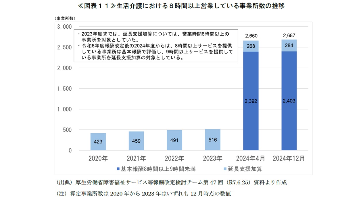 延長支援加算の推移をみると、2023年に営業時間が8時間以上の事業所は516事業所だったが、2024年4月時点では、8時間以上サービス提供をしている事業所は2,660事業所と大きく増加し、2024年12月時点ではさらに増加した≪図表11≫。しかし、9時間以上のサービス提供は約1割にとどまる点に留意が必要だ。