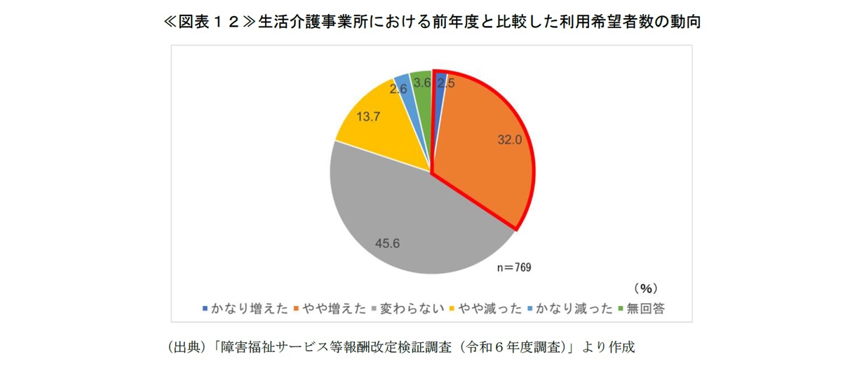 改定後の生活介護事業所においてサービス提供時間を延長する動きはあるが、9時間以上のサービス提供を行う事業所は約1割にとどまっていることが確認できた。生活介護事業所が、放課後等デイサービスを利用していた特別支援学校の卒業生の夕方以降のニーズに対応できているかについては、現時点で直接的に確認できるデータは現時点では存在しないため、今後の検証を待ちたい。ここでは、生活介護事業所が「18歳の壁」の受け皿として期待されている状況を確認しておく。2024年に、生活介護事業所における利用希望者数の動向を聞いたところ、「変わらない」は約46%だが、「利用希望者が増えた」と回答した割合(「かなり増えた」「やや増えた」の合計)は、3割を超えている≪図表12≫。