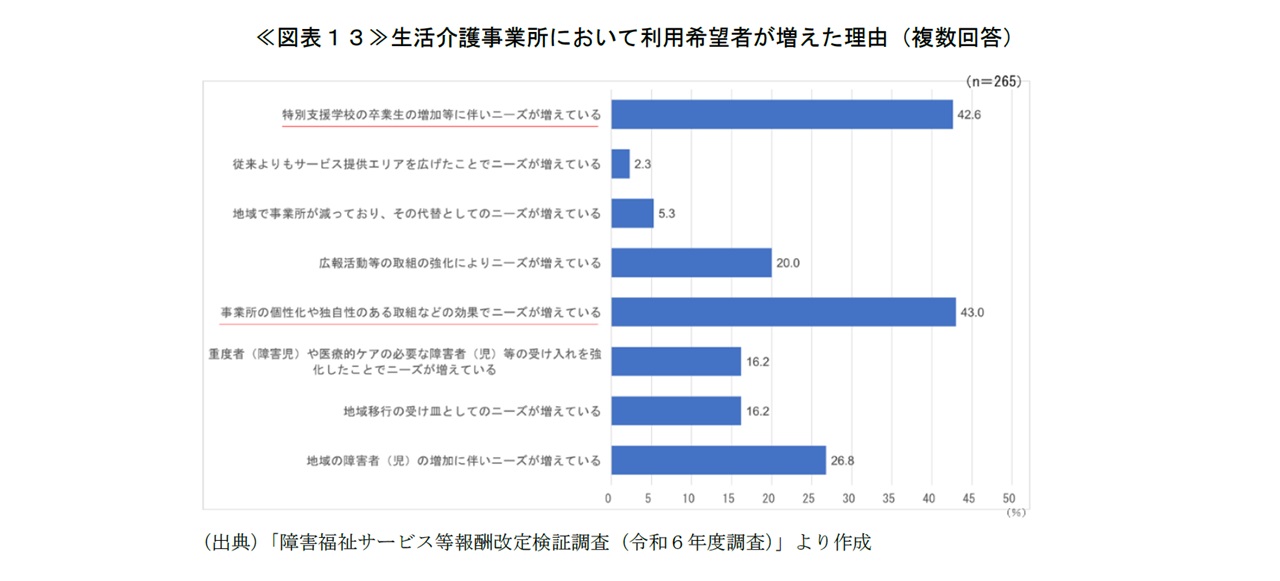 前年度より「利用希望者が増えた」と回答した事業所にその理由を尋ねたところ、「事業所の個性化や独自性のある取組などの効果でニーズが増えている」「特別支援学校の卒業生の増加等に伴いニーズが増えている」との回答が多くなっている≪図表13≫。近年、特別支援学校の卒業生は減少傾向である6にも関わらず、「特別支援学校の卒業生の増加等に伴うニーズが増えている」と回答する背景には、放課後等デイサービスを利用していた卒業生の夕方以降の利用希望の増加があると考えられる。また、生活介護における事業所独自の取組としては、ニーズを受けて延長受入れを行うことの他に、放課後等デイサービスと生活介護事業所等の複数の障害福祉サービスをひとつの空間で行う取組7などが挙げられる。