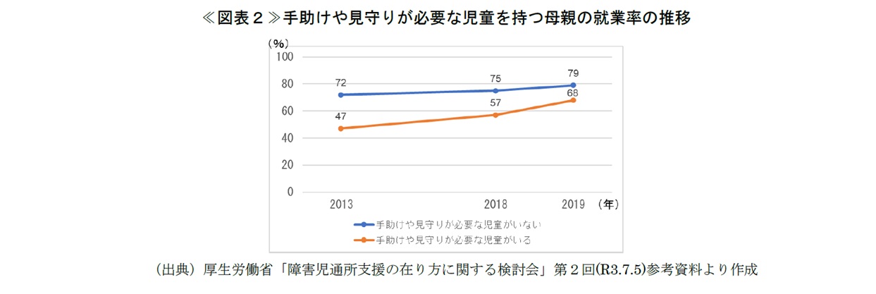 厚生労働省が実施する国民生活基礎調査によると、手助けや見守りが必要な児童を持つ母親の就業率は、大きく上昇してきている≪図表2≫2。こうした背景を要因の一つとして、放課後等デイサービスの利用児童数は増加傾向にあると言える≪図表3≫。