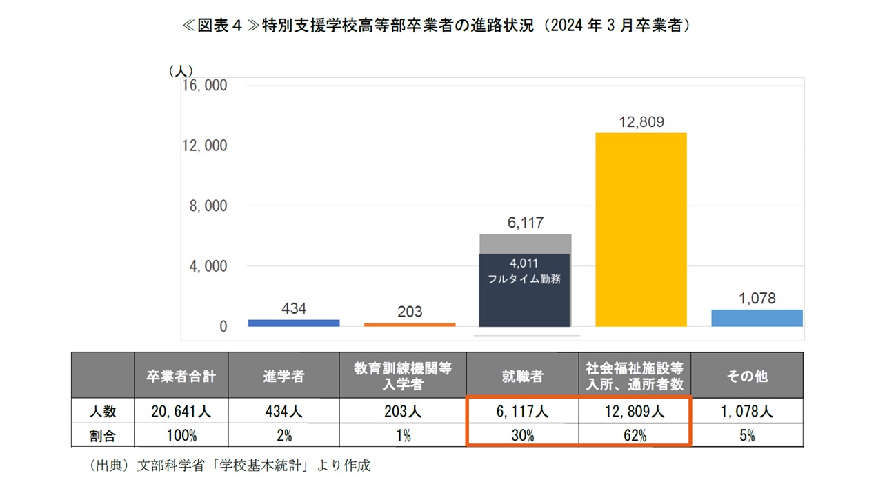 2024年3月に特別支援学校高等部を卒業した障害者20,641人の卒業後の進路をみると、社会福祉施設等に入所、通所する者が最も多く12,809人で62%を占める。就業者は6,117人で卒業者の30%を占める≪図表4≫。ただし、この就業者数は無期雇用労働者のみならず有期雇用労働者や臨時労働者を含んでいることに留意が必要だ。就業者6,117人のうち、無期雇用労働者と雇用契約期間が一年以上かつフルタイム勤務相当の有期雇用労働者のみを集計すると4,011人で、フルタイム勤務(相当)で働く就職者は、卒業者全体の19%で2割に満たない。