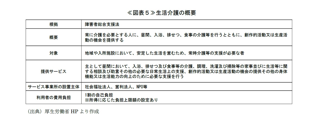 厚生労働省は、「18歳の壁」に関し、障害者の日中の活動をより充実する観点から、「令和6年度障害福祉サービス等報酬改定」において、障害者福祉サービス3のうち、介護給付の一つである「生活介護」≪図表5≫の延長支援加算を拡充し、夕方の預かりニーズへの対応を行っていると説明する4。生活介護に関する「令和6年度障害福祉サービス等報酬改定」の概要は以下の通りである。