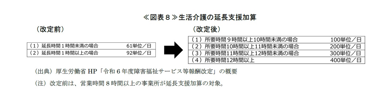 延長支援加算については、改定後はサービス提供時間について8時間以上9時間未満までを想定して基本報酬を設定する≪図表7≫ことから、9時間以上の支援を加算対象として評価し、以降1時間ごとに100単位の従来よりも手厚い加算が設定された≪図表8≫。