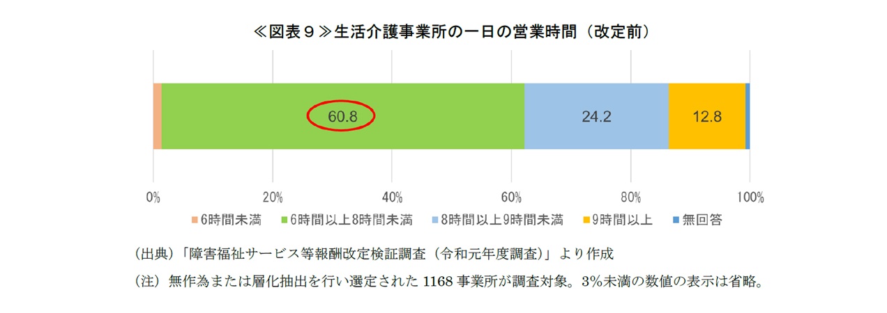 放課後等デイサービスの利用状況等から、今後も特別支援学校等を卒業した障害者の障害福祉サービスへのニーズは増えていくだろう。「令和6年度障害福祉サービス等報酬改定」を受け、サービス提供時間を増やす生活介護事業所が増加し、障害者やその保護者のニーズの受け皿が一定拡充されたことについては前向きに評価できる。しかし、延長ニーズがあったとしても実際の延長の有無や延長幅は事業者の経営判断に拠るところが大きい。2024年時点で9時間以上のサービス提供をしている事業所は限定的であることからも、実際のニーズに十分対応できているか定かではない。国には、支援機関や当事者団体の意見を丁寧に聴取し、実態把握を進めるよう求めたい。