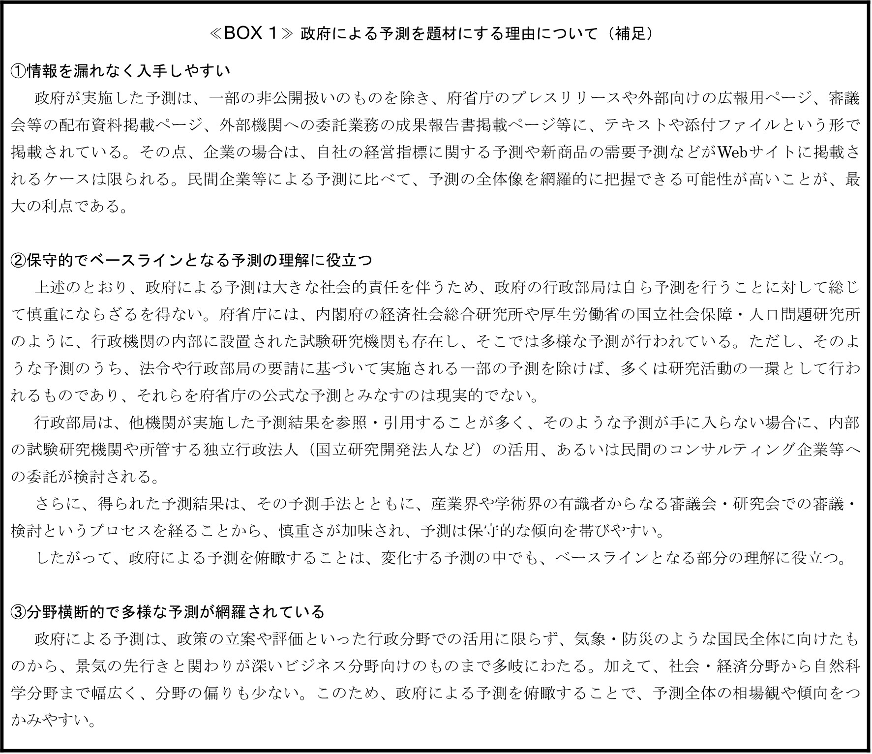 「政府による予測」は、その社会的責任の重さゆえに保守的な性格を帯びる傾向があり、同時に、予測が現実社会や政策に影響を及ぼす可能性を意識して発せられる点で、期待や誘導を含めた強いメッセージ性をもつ1(このほか、政府による予測を取り上げた理由については、≪BOX1≫に補足した)。