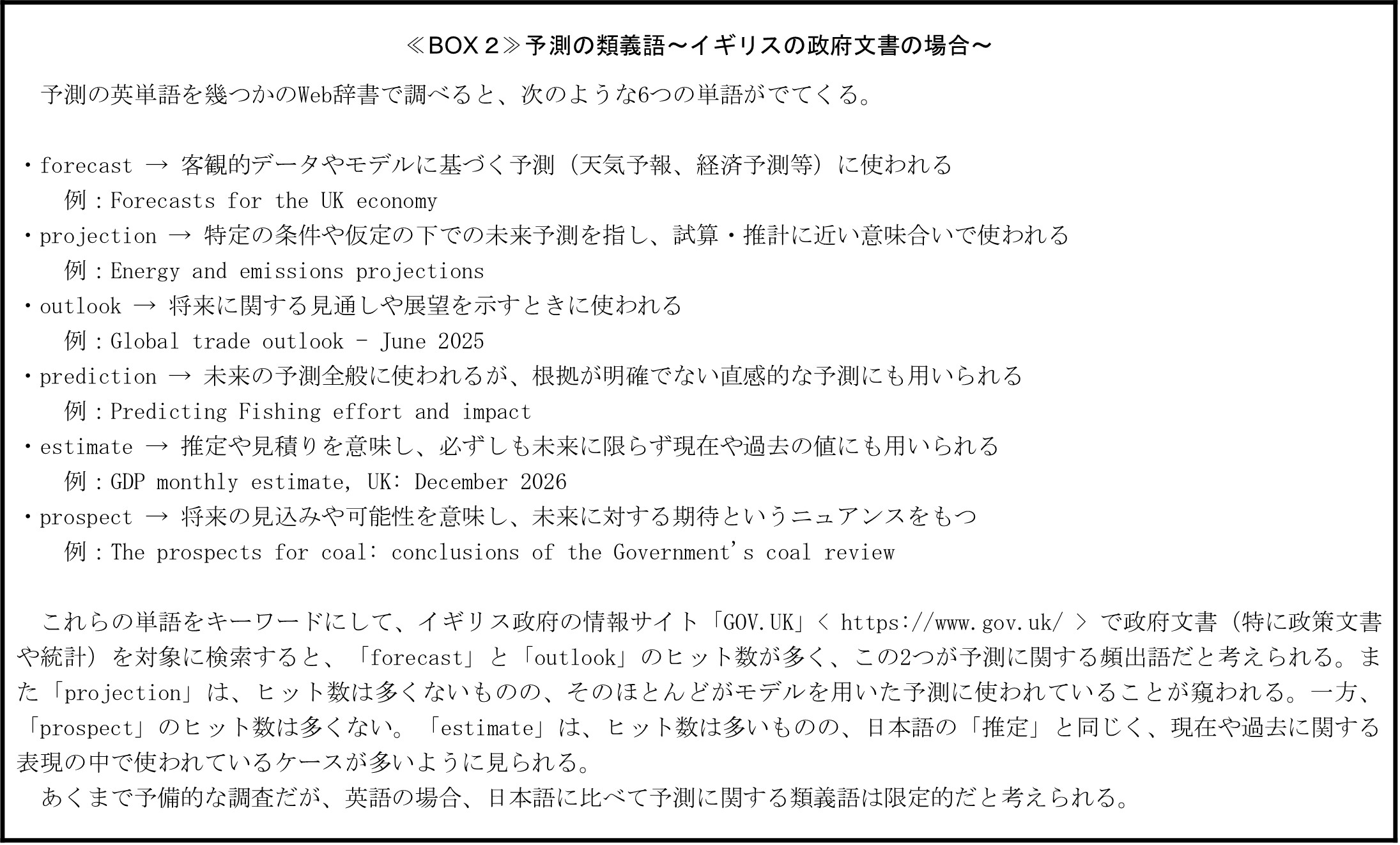 なお、英語における「予測」について、≪BOX2≫に参考情報として補足した。