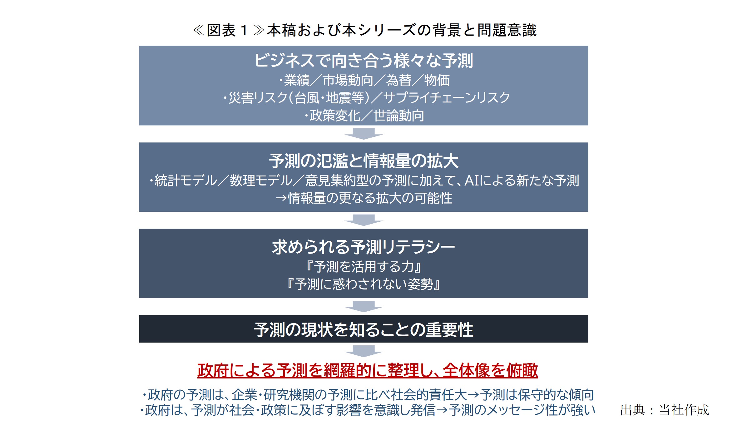 そこで、本稿を含めた4本のレポートでは、「政府による予測」に焦点を当て、その実態や傾向を明らかにし、現時点における政府の予測力の一端を明らかにすることを目指す≪図表1≫。