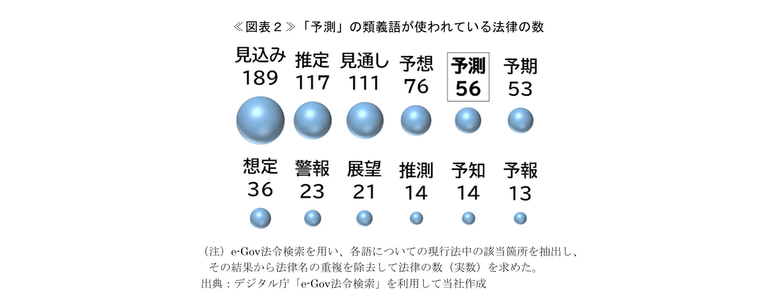 次に、これらの語が法律にどの程度使用されているかを、デジタル庁公開による「e-Gov法令検索」を用いて調べた。法律における用語の使い方は、一般の行政文書とはやや異なる部分があるものの、国の公式文書という点で共通しており、予測の類義語の使われ方を把握するための手掛かりになる。